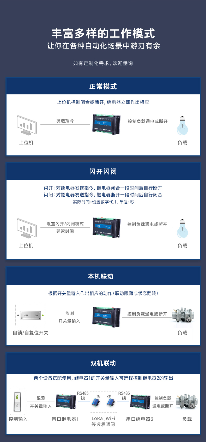 | 工作模式更改;继电器独立控制;继电器整体控制;开关量状态查询;调试信息查询;控制软件;支持各家组态软件;支持 Labview 等 | |||